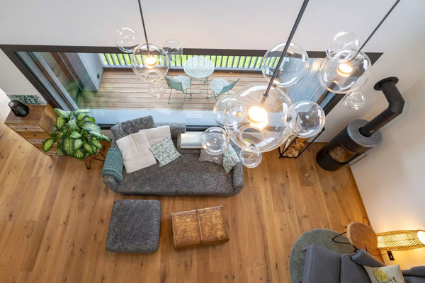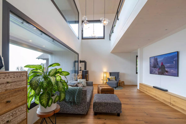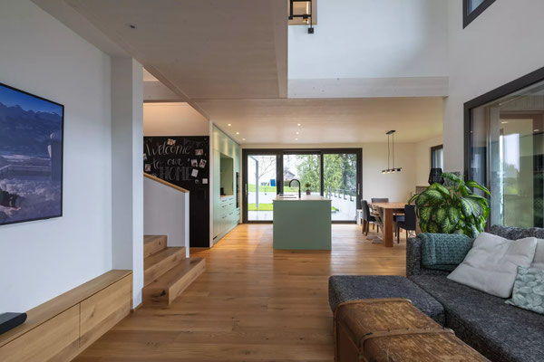 Auch innen ist durch die lasierten Holzdecken, die insbesondere im grosszügigen Wohn-Essbereich an eine Holz-Kassettendecke erinnert, erkennbar, in welchem Bereich das Haus aus Holz gebaut ist.