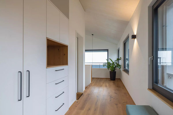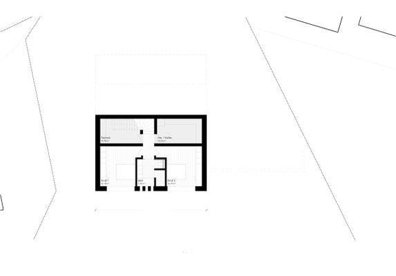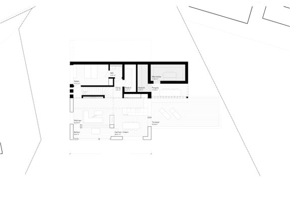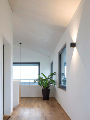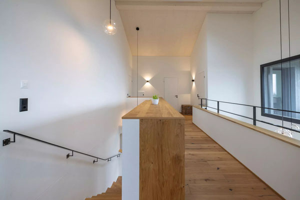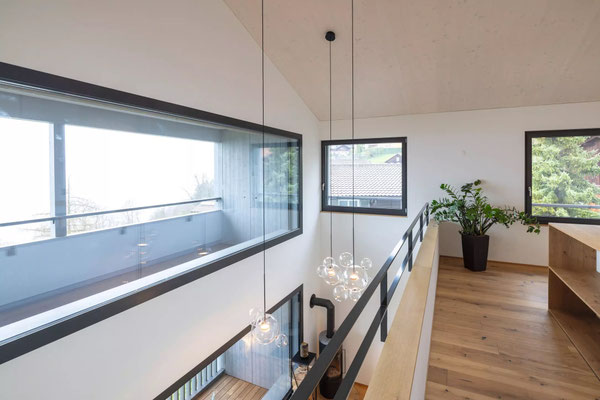 Durch die erforderliche Abtreppung des Sockelbereichs, um den Hanganschnitt möglichst gering zu halten, mussten wir uns für das räumliche Konzept etwas einfallen lassen und haben eine Antwort darin gefunden, dass der Elternschlafbereich im Dachgeschoss und die Kinderzimmer im Untergeschoss untergebracht werden. Der im Geschoss dazwischen liegende Wohn-Essbereich mit der grossen Terrasse mit Pergola verbindet die beiden Zonen miteinander. Um diese Verbindung weiter zu stärken, wurde der über dem Wohnbereich liegende Luftraum so angeordnet, dass dieser als Galerie im Elternbereich funktioniert. Tritt man aus dem Elternzimmer, befindet man sich dadurch gefühlt bereits im Wohngeschoss, obwohl sich dieses ein Geschoss darunter befindet.