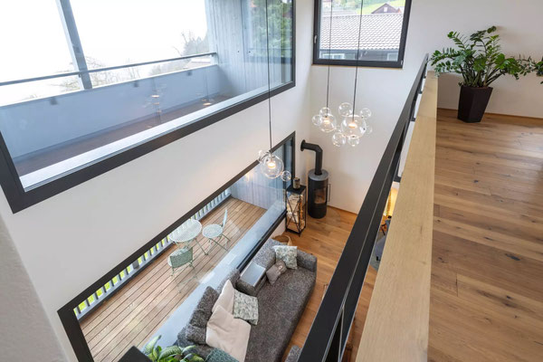 So verschmelzen alle Bereiche des Hauses und durch die Anordnung der Zimmer und des Luftraums wird man ständig von der atemberaubenden Aussicht begleitet.