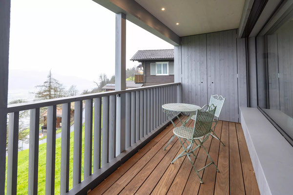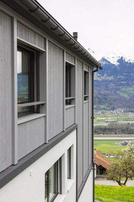 Weil es der Bauherrschaft wichtig war, dass die Holzfassade nicht ungleichmässig verwittert, haben wir uns für eine Vorvergrauung entschieden, die dem Holz den Charakter einer bereits verwitterten Fassade gibt, diese aber besser kontrollierbar ist, als die ‘natürliche’ Verwitterung – und vor allem schon vom ersten Tag an dieses Bild erzeugt wird, ohne Jahre warten zu müssen, bis das Holz seine natürliche ‘Patina’ erhält.